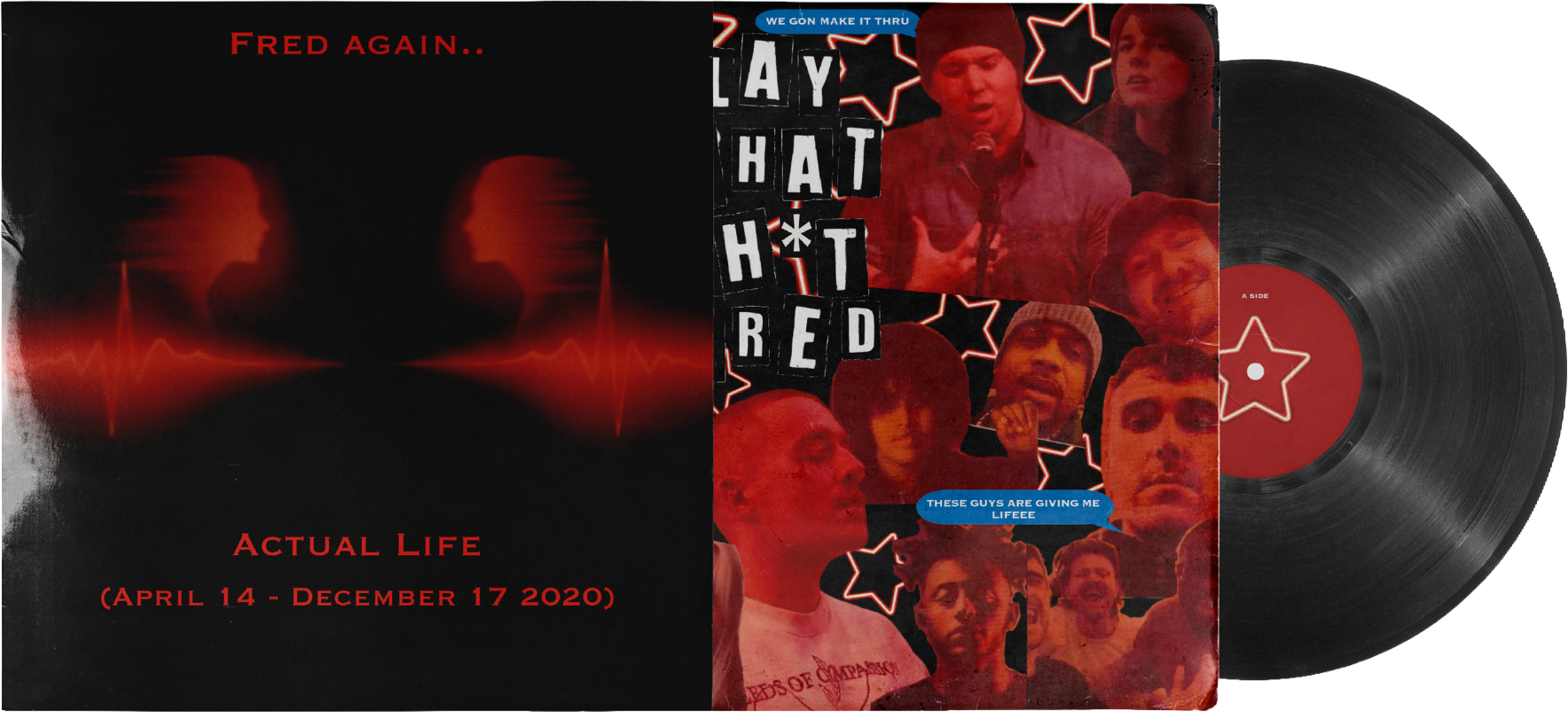 I wanted to pay homage to Fred again..’s unique style of making music. He is known for taking samples of people, artists, poems, or anything he finds inspiration from into his songs. In his three albums called Actual Life, the title of each song is the name of the person who inspired the song. In this first album and redesign, I included real pictures of the people who were featured and titled after.